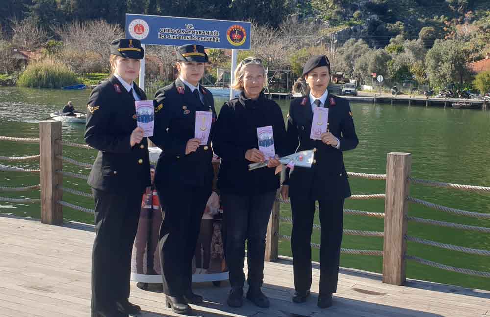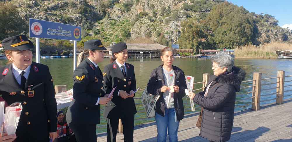 Ortaca ilçe Jandarma komutanlığında görevli kadın Assubaylar Dalyan mahallesinde 8.Mart Dünya kadınlar günü nedeniyle kadınlara karanfil verdiler.Kaunos Çay bahçesinde kurulan stantta KADES (Kadın acil destek uygulaması)Uygulaması hakkında bilgi vererek tanıtım broşürü dağıttılar.