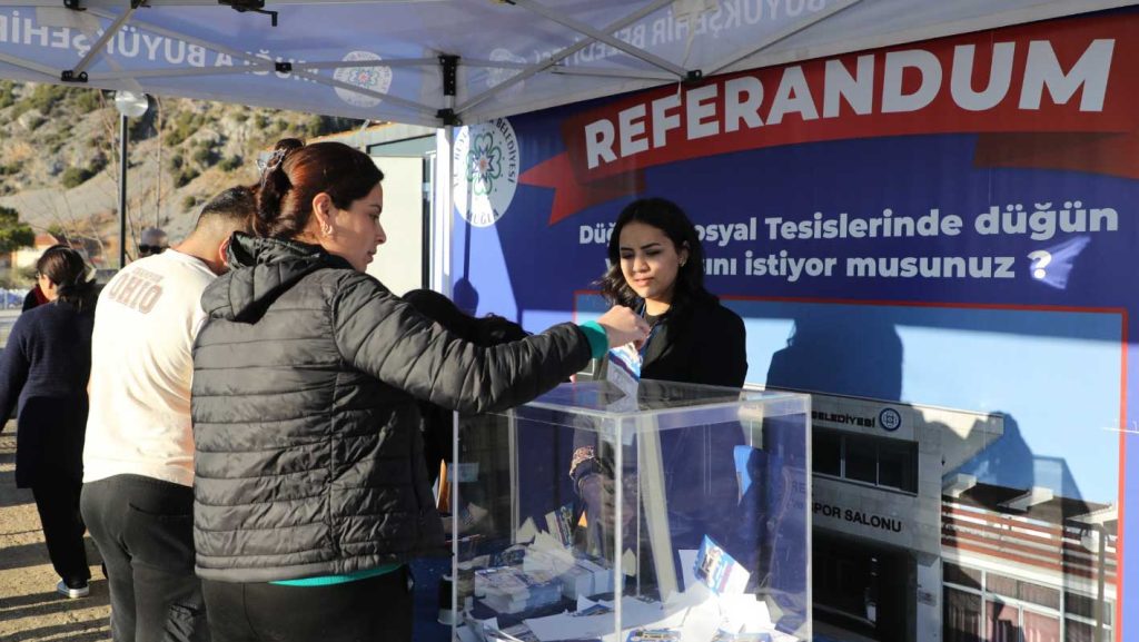Katılımcı belediyeciliğe önem veren Muğla Büyükşehir Belediyesi, Menteşe Kent Park için yapılan referandumdan sonra Düğerek Mahallesi’ndeki Büyükşehir Sosyal Tesisleri ve Spor Salonu’nda düğün yapılıp yapılmaması konusunu da halka sordu.