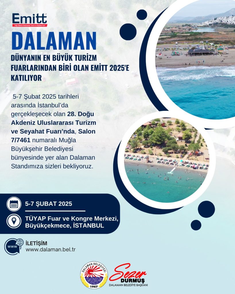 Dünyanın en prestijli turizm etkinliklerinden biri olan EMITT, 5-7 Şubat 2025 tarihleri arasında İstanbul TÜYAP Fuar ve Kongre Merkezi’nde kapılarını açacak. Dalaman Belediyesi, ilçenin birbirinden güzel koylarını ve tarihi dokusunu fuarda ziyaretçilere tanıtacak. Dalaman standı, Salon 7’deki 7461 numaralı Muğla Büyükşehir Belediyesi bünyesinde yer alacak.